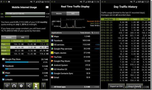 Data Usage Monitor no incluye funciones adicionales como las demás, sino que se centra en su objetivo de monitorear los datos móviles. Esta es tu aplicación ideal si deseas una aplicación simple de monitoreo de datos. Debes configurar tus límites de datos y posicionar el medidor en tu pantalla. Podrás mantener a la vista el consumo de datos desde la pantalla principal de la aplicación; y muestra el uso de datos por horas y también por aplicaciones.