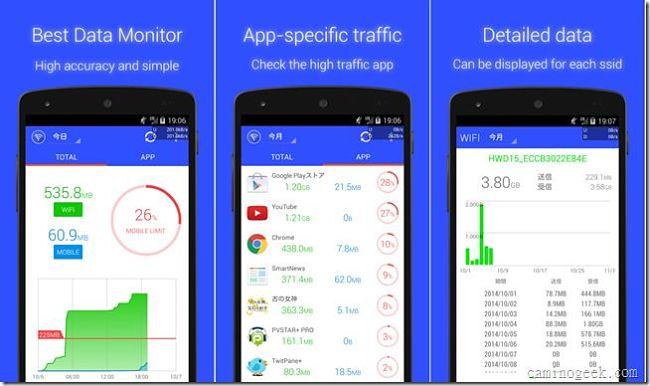 Traffic Monitor es una app todo en uno con varias utilidades integradas. Entre éstas encontrarás un medidor de velocidad, monitor de uso de datos, chequeo de calidad de señal e información de red. Con esta puedes configurar un límite de uso de datos, y también puedes chequear el uso de datos por localización. Incluye una opción para configurar widgets para monitorear el uso de datos desde la misma pantalla de inicio.